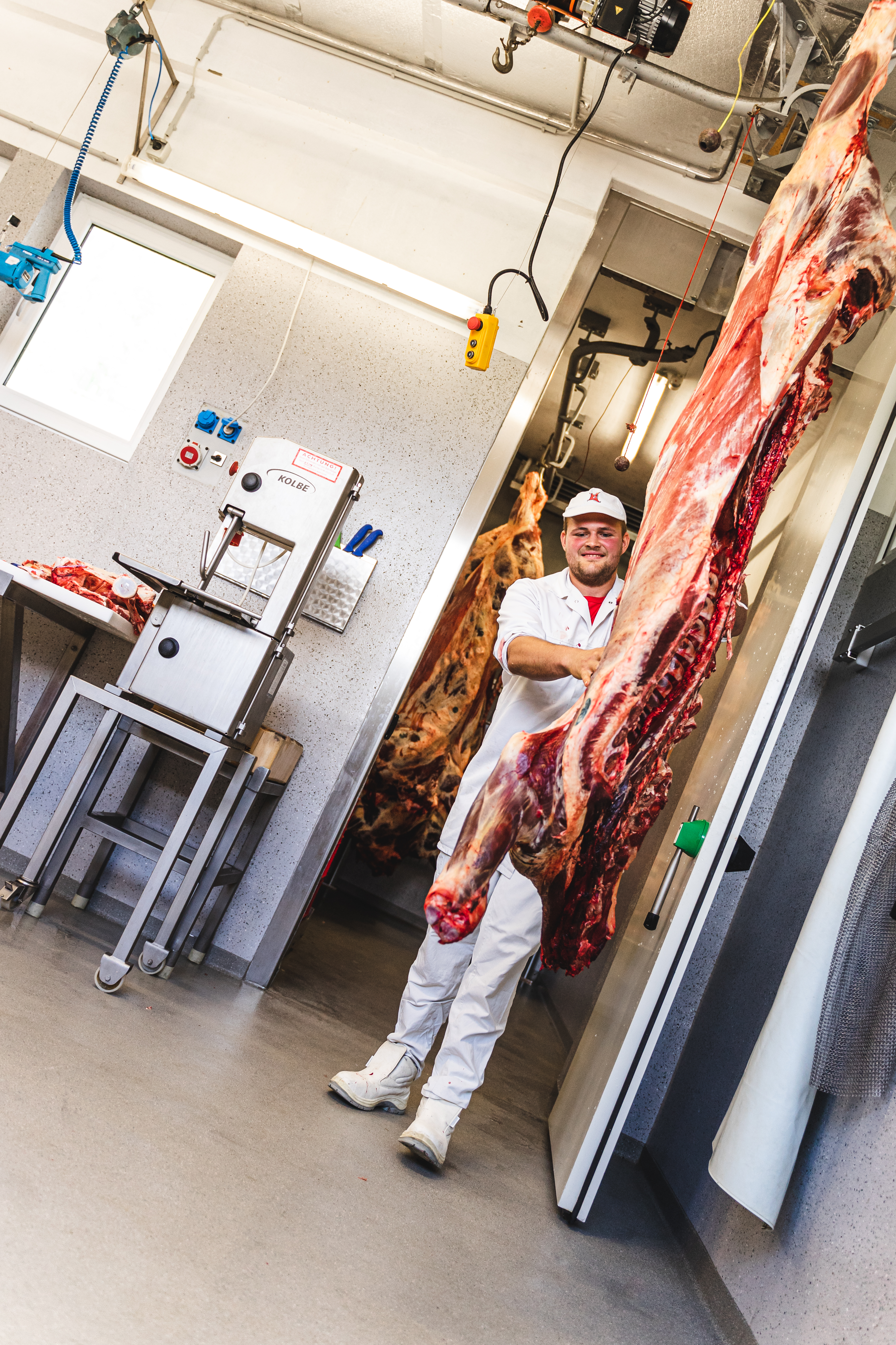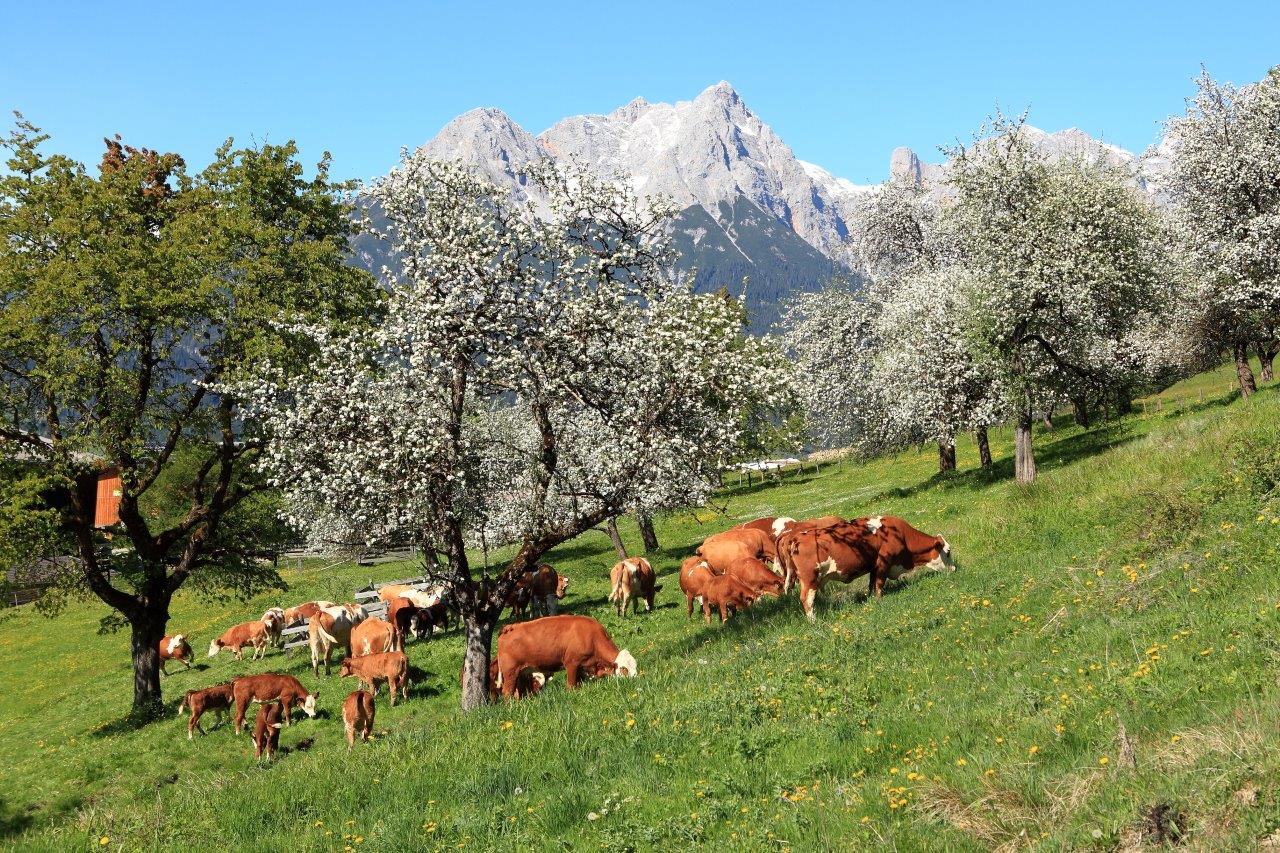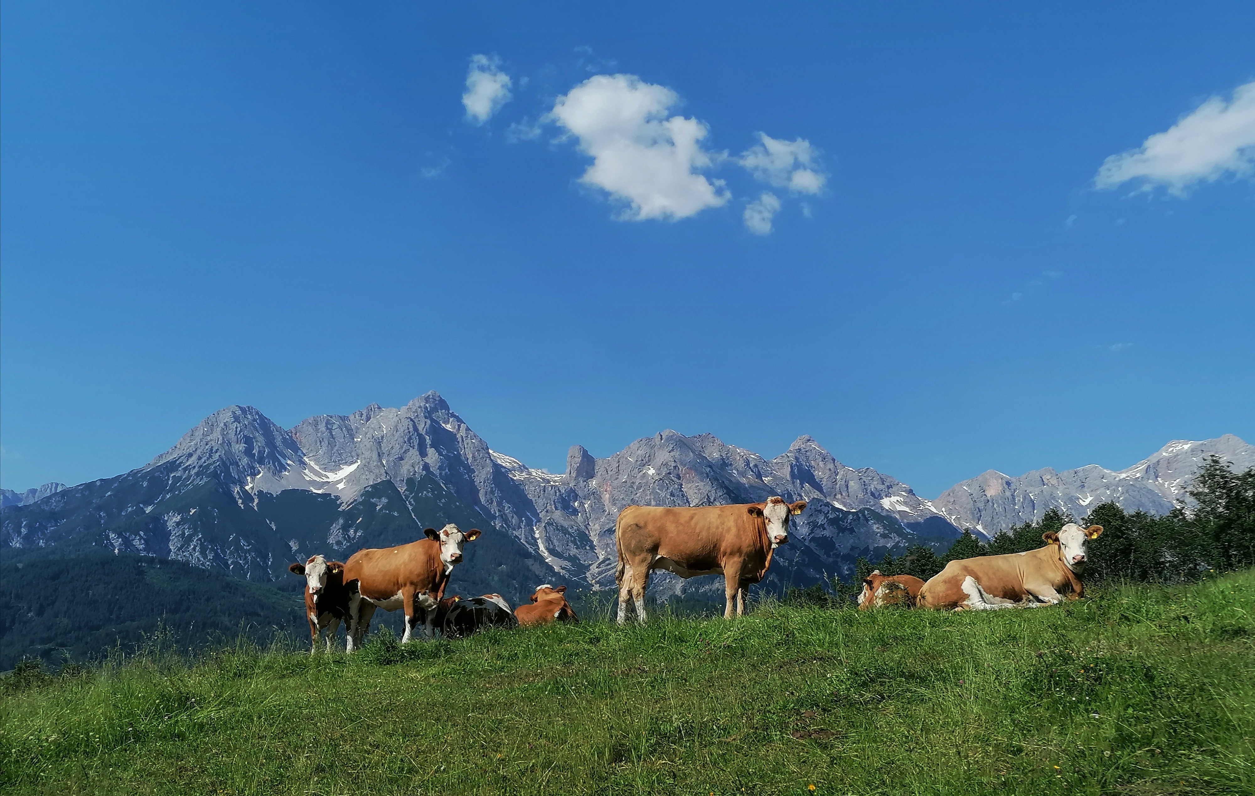 Bei den Kühen achtet Siegfried auf Tiere mit gutem Mutterinstinkt, die gesunde und robuste Kälber hervorbringen. 2 Stiere sind im Einsatz, ein Fleck und ein Limousin. Nach Möglichkeit kommen die Mutterkühe aus eigener Nachzucht. Bei der Futtergewinnung steht gute Qualität im Vordergrund. Der Großteil der Wiesen wird 3 Mal gemäht und anschließend beweidet. Etwa die Hälfte des Futters wird im Fahrsilo einsiliert und die andere Hälfte wird auf der Heubelüftung fertig getrocknet. Um die gute Qualität des Bio-Jungrindfleisches zu erreichen, bekommen die Kälber im Winter immer Heu ad libitum und werden auch in den Sommermonaten 6 Wochen vor dem Schlachttermin vorrangig mit Heu gefüttert. Auch die Parasitenbekämpfung wird ernst genommen und bei allen Tieren frühzeitig durchgeführt. Im Sommer sind die Tiere sonst auf der Oberdeutingalm bei Dienten. Hier sind besonders die lange Almzeit (Auftrieb bereits Anfang/Mitte Mai) und der lange Almweg von 24 km über den Filzensattel hervorzuheben. Die Alm liegt auf 1200 bis 1500 Metern.