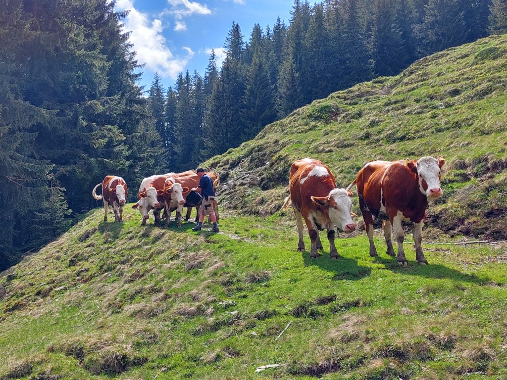 Auch die Jungtiere und das Kleinvieh sind im Sommer auf der Alm. Die Kühe bleiben im Tal auf der Kurzrasenweide und kommen nur zum Melken in den Stall. Die Kälber werden als leichtes Milchkalb in der Region vermarktet, die Nachzucht über den Rinderzuchtverband verkauft. Das Fleisch von Schlachttieren wird für die Alm und für den Betrieb in Leogang verarbeitet und lokal vermarktet.